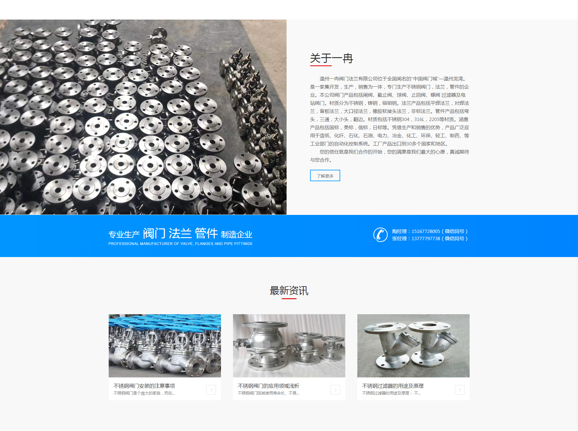 溫州一冉閥門法蘭有限公司位于全國聞名的“中國閥門城”—溫州龍灣。是一家集開發(fā),生產(chǎn),銷售為一體,專門生產(chǎn)不銹鋼閥門,法蘭,管件的企業(yè)。本公司閥門產(chǎn)品包括閘閥、截止閥、球閥、止回閥、蝶閥 過濾器及電站閥門。材質(zhì)分為不銹鋼,鑄鋼,鉻鉬鋼。法蘭產(chǎn)品包括平焊法蘭,對焊法蘭,盲板法蘭,大口徑法蘭,橡膠軟接頭法蘭,非標法蘭。管件產(chǎn)品包括彎頭,三通,大小頭,翻邊。材質(zhì)包括不銹鋼304,316L,2205等材質(zhì)。涵蓋產(chǎn)品包括國標,美標,俄標,日標等。憑借生產(chǎn)和銷售的優(yōu)勢,產(chǎn)品廣泛應用于造紙、化纖、石化、石油、電力、冶金、化工、環(huán)保、輕工、制藥、等工業(yè)部門的自動化控制系統(tǒng)。工廠產(chǎn)品出口到30多個國家和地區(qū)。